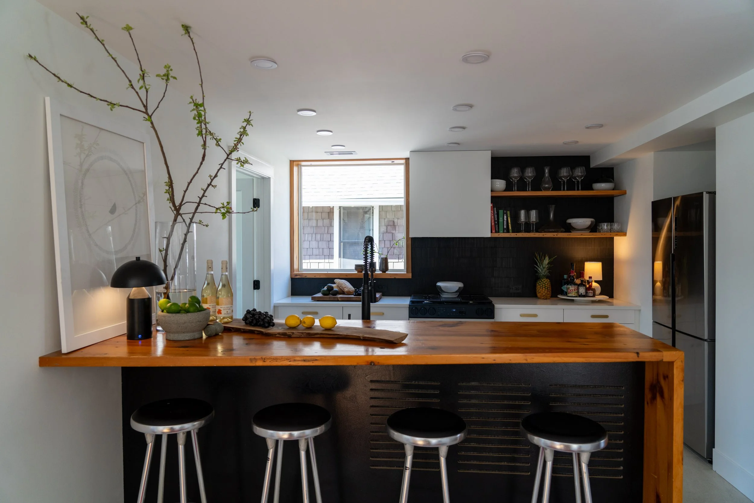 The kitchen serves as a central gathering space, anchored by a custom wood bar and designed to feel open, social, and connected to the rest of the home.
